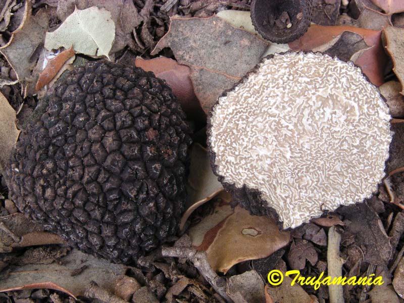 FULL DESCRIPTION Winter truffle is very similar in external appearance to the Tuber melanosporum, although the interior is greyish brown, and with sparse, broad, whitish veins. Its skin peels off easily when brushed. Winter truffle ripens at the same time and habitat as Tuber melanosporum, but prefers moist sites. The aroma is lightly musky and less persistent.